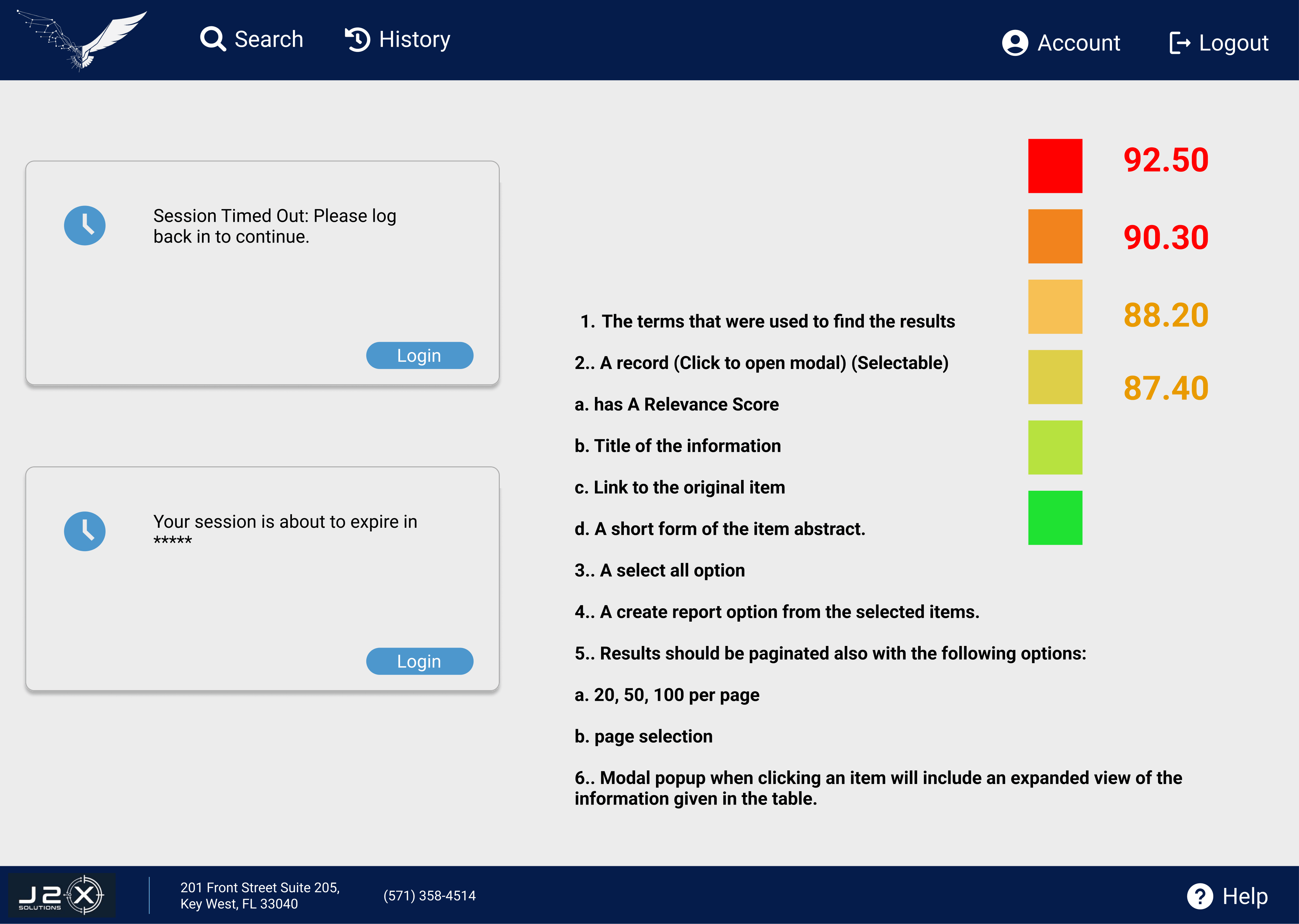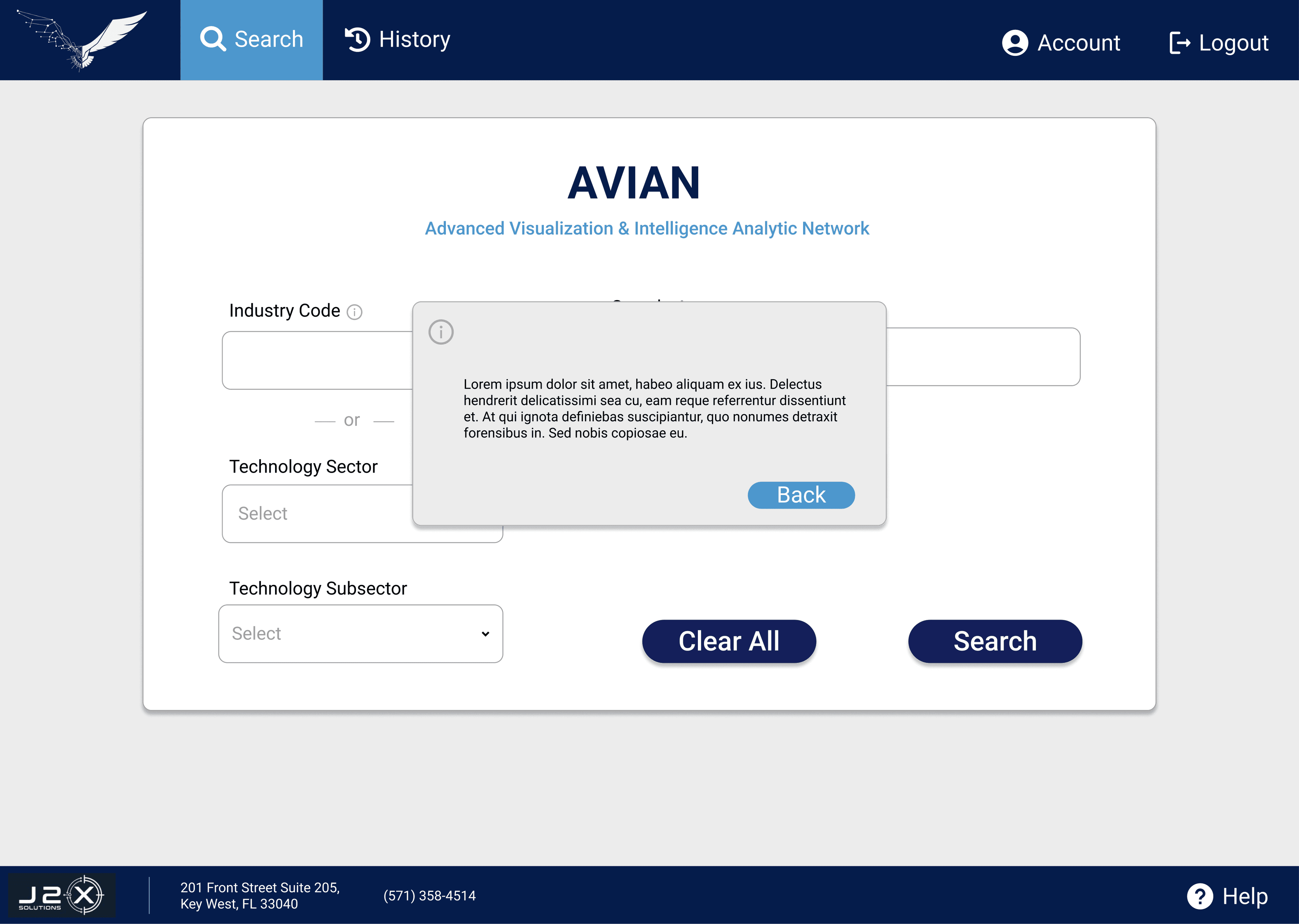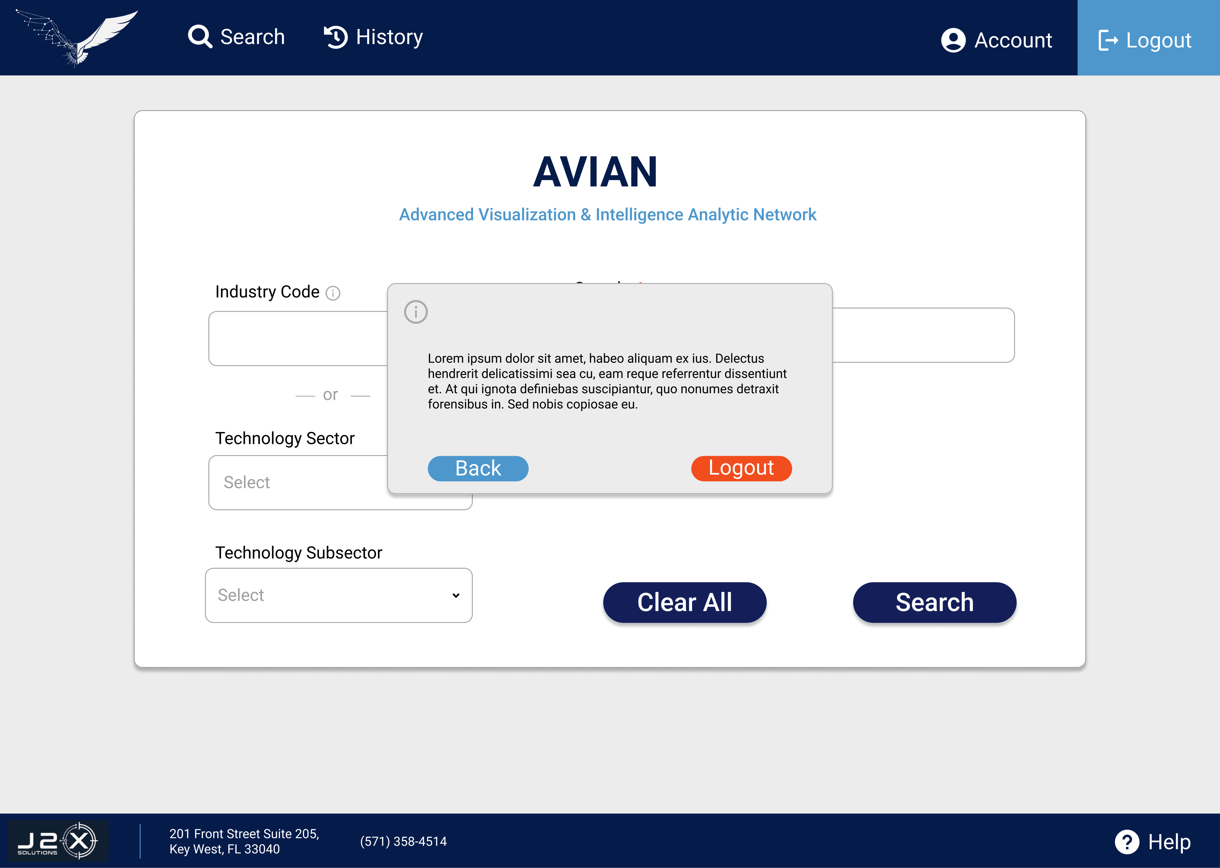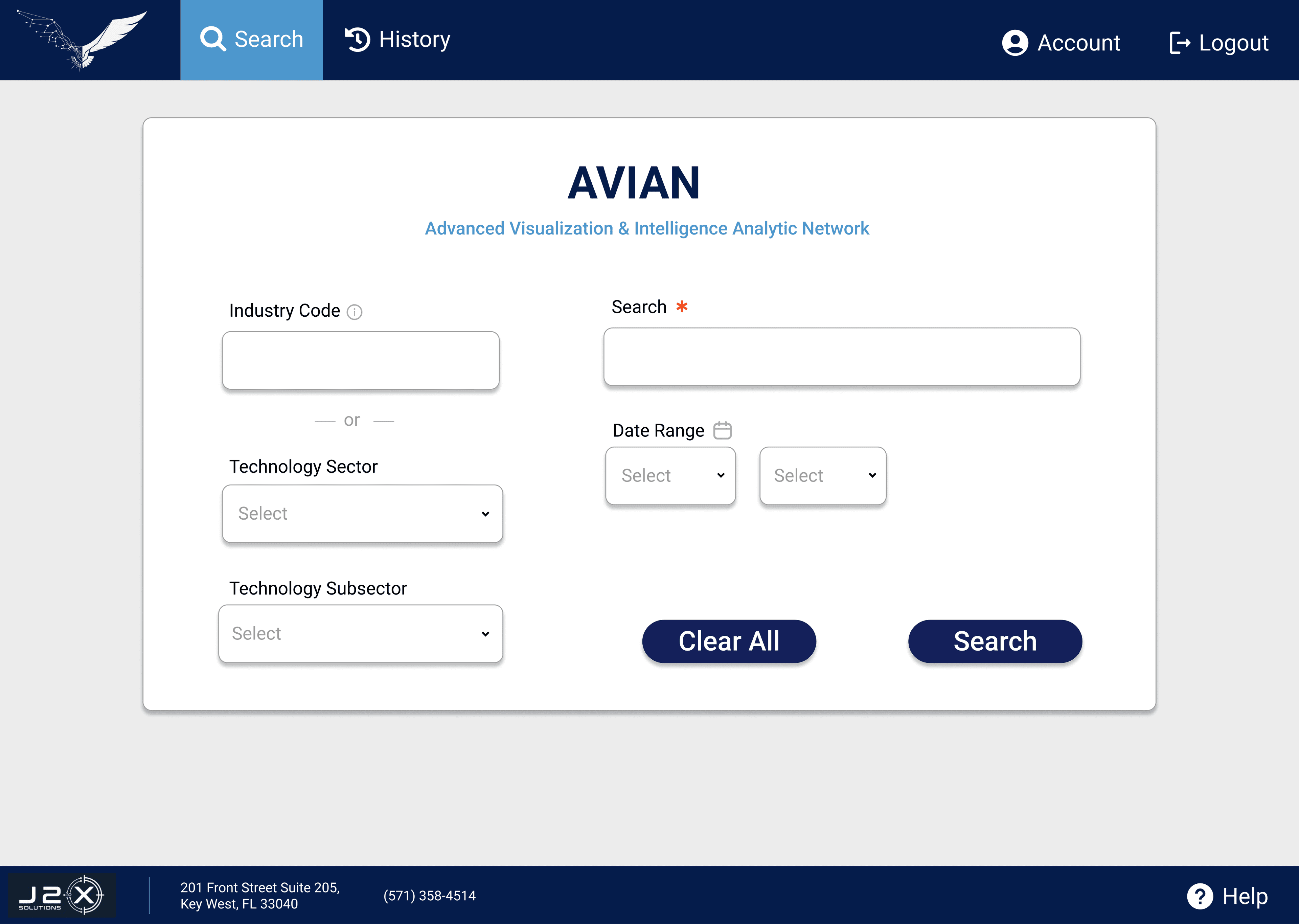 AVIAN aggregates web data into a structured, searchable repository and generates AI-powered risk scores. I designed the complete UX from government access warning flow through search, scoring, modal detail views, and session management.
